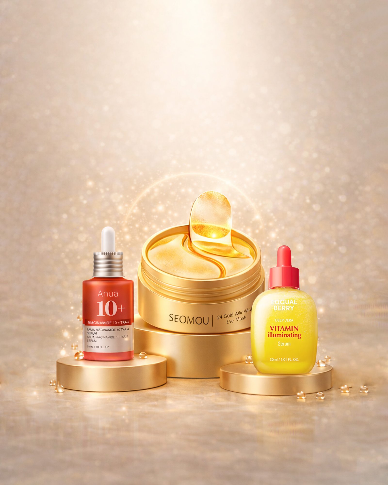A complete skincare routine featuring ANUA brightening serum, EqualBerry Vitamin C serum for glow and radiance, and gold under-eye masks to reduce dark circles and puffiness for a more refreshed and luminous look.